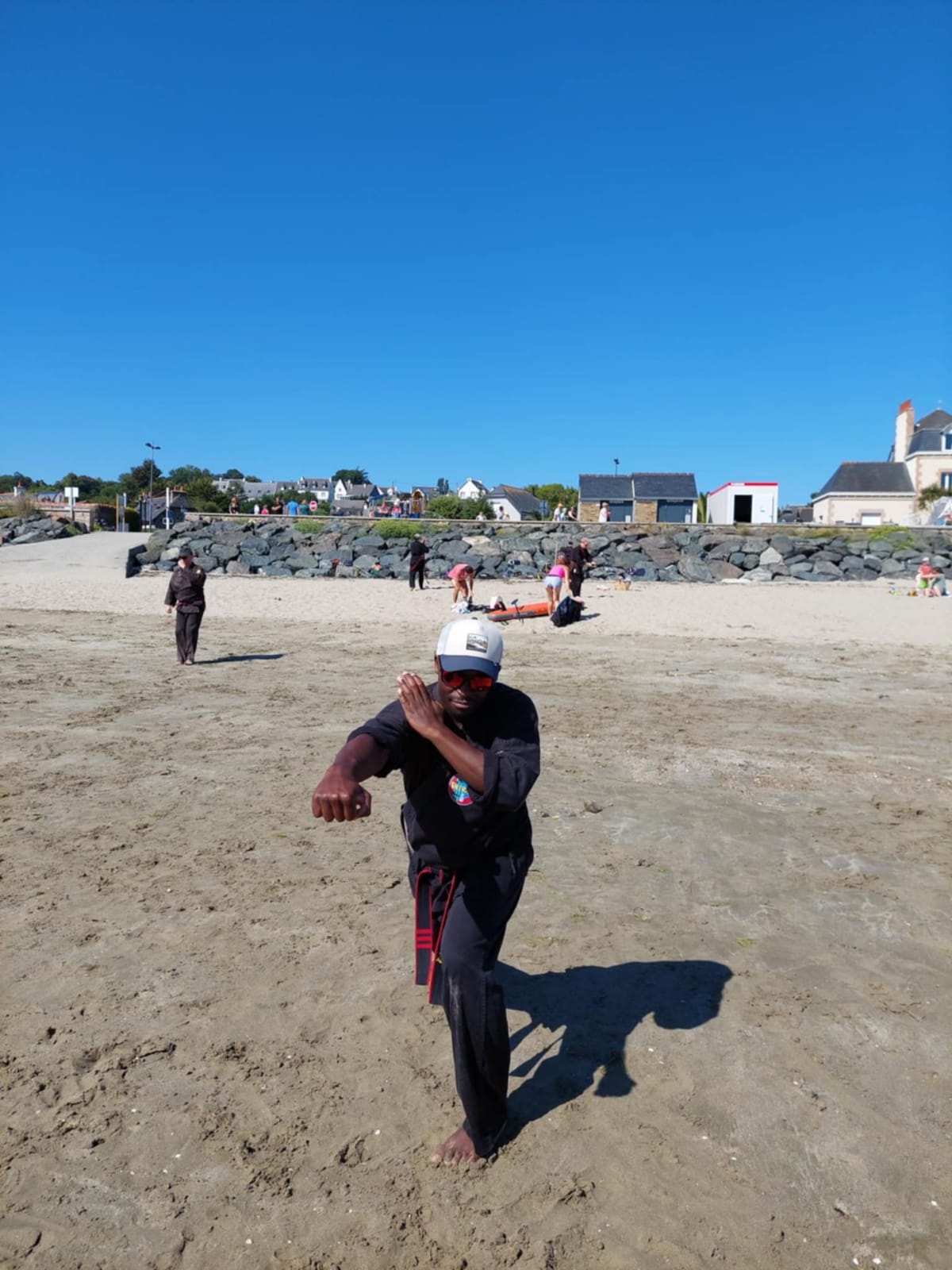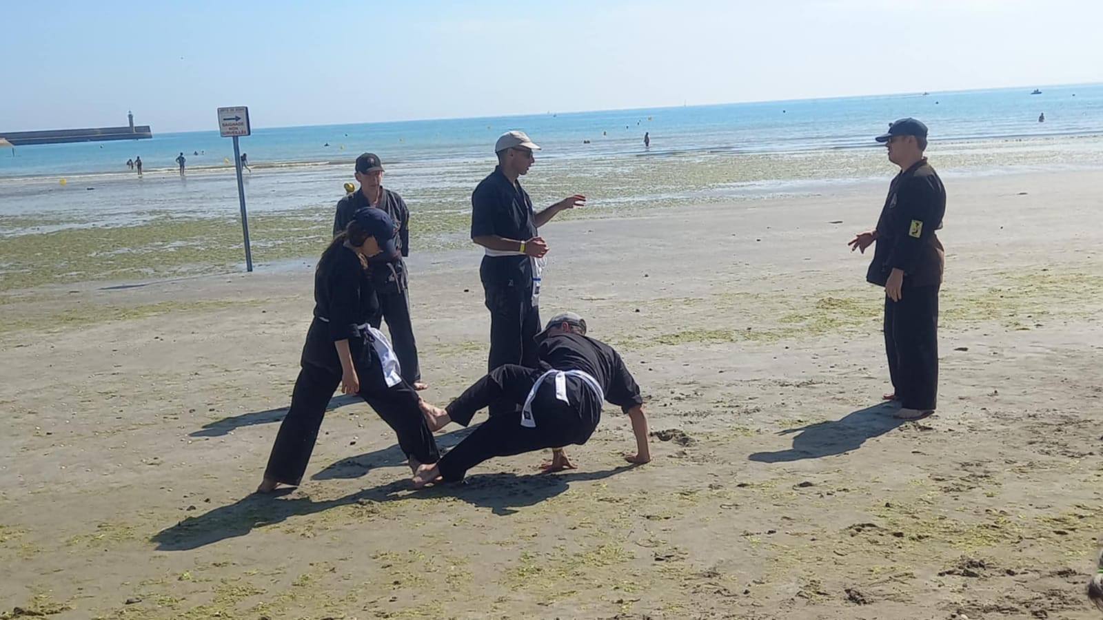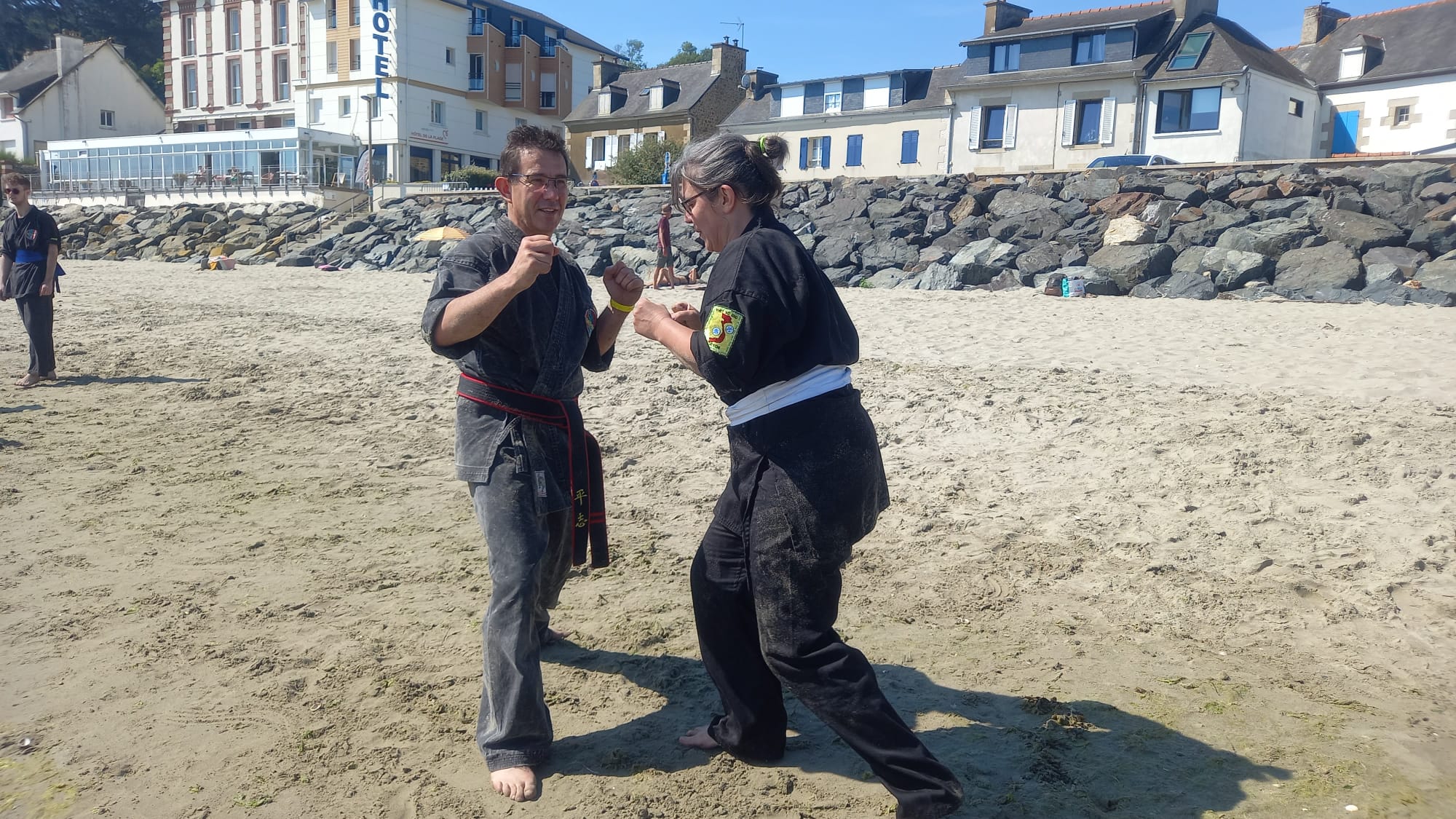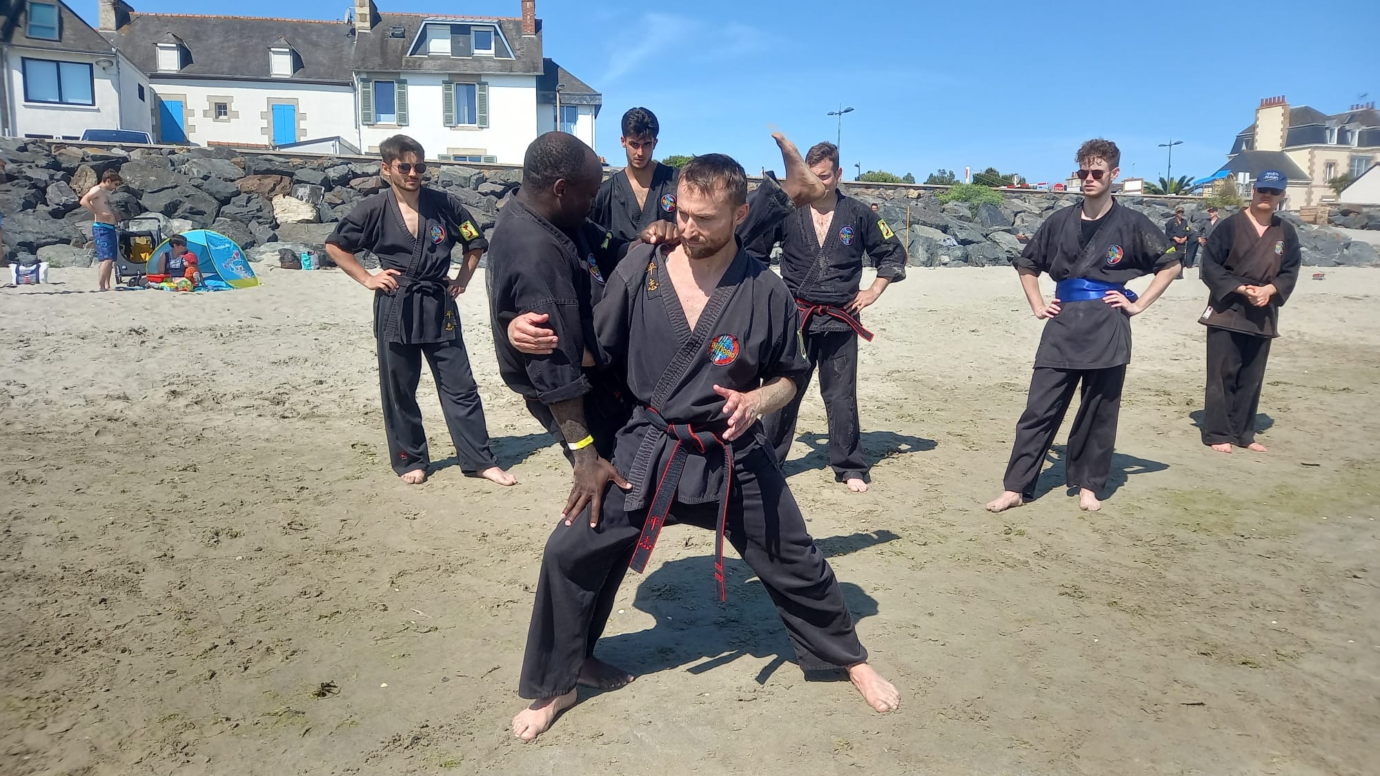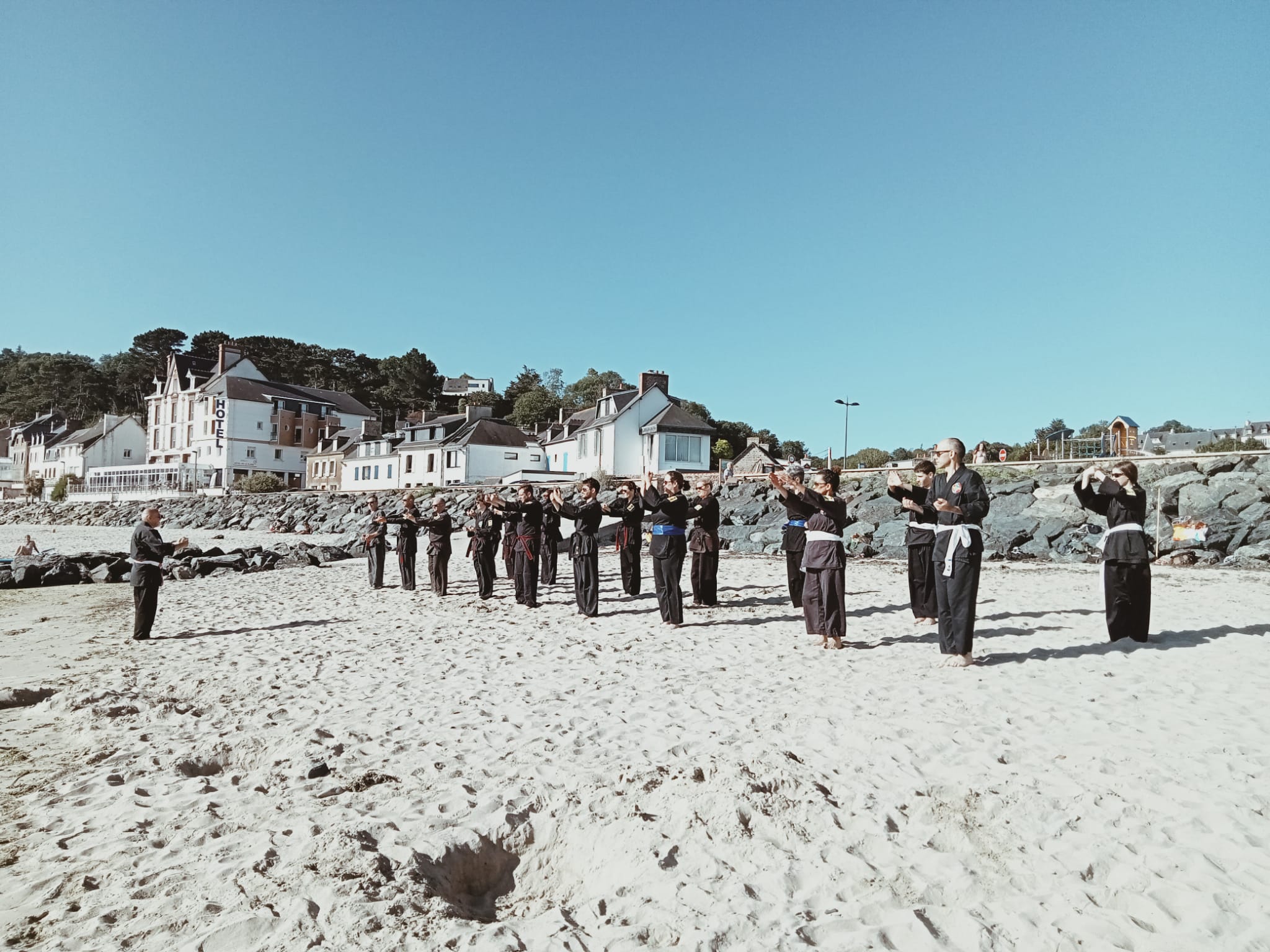 Dès le samedi matin, les plus matinaux ont lancé le stage par un footing avec Maëva, avant de se retrouver tous ensemble sur le sable pour une première session technique sous un soleil écrasant. Au programme : révisions des quyền mains nues de l’École, concentration… et transpiration ! L’après-midi libre a permis à chacun de récupérer à sa manière : balade, baignade, glace ou sieste. Le soir, tout le monde s’est retrouvé autour d’un bon repas au restaurant.