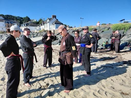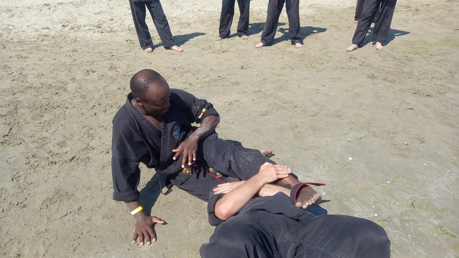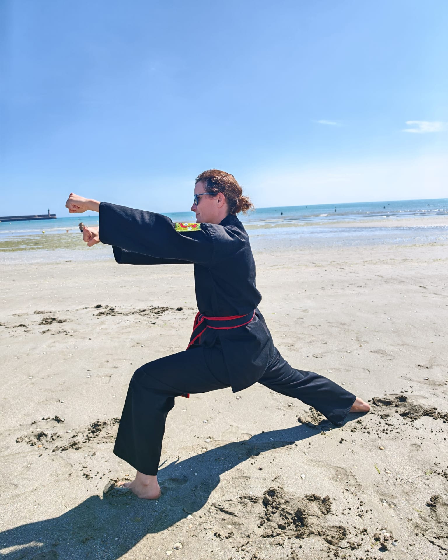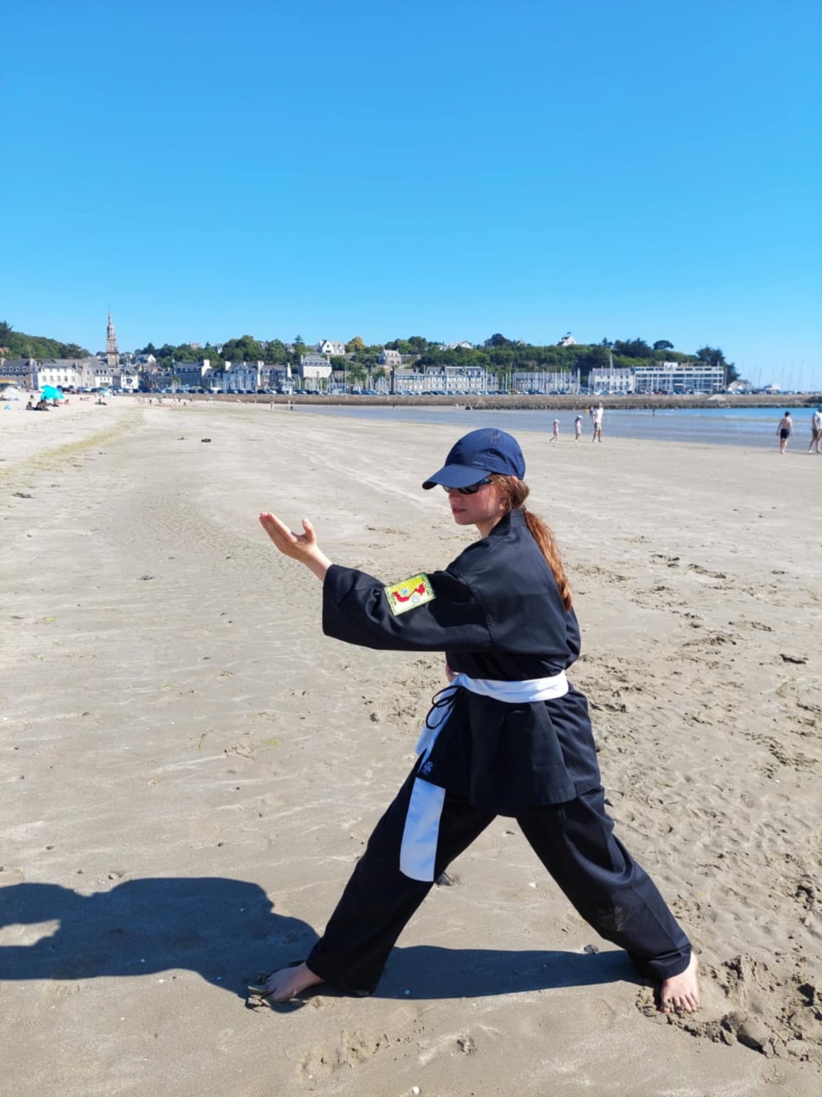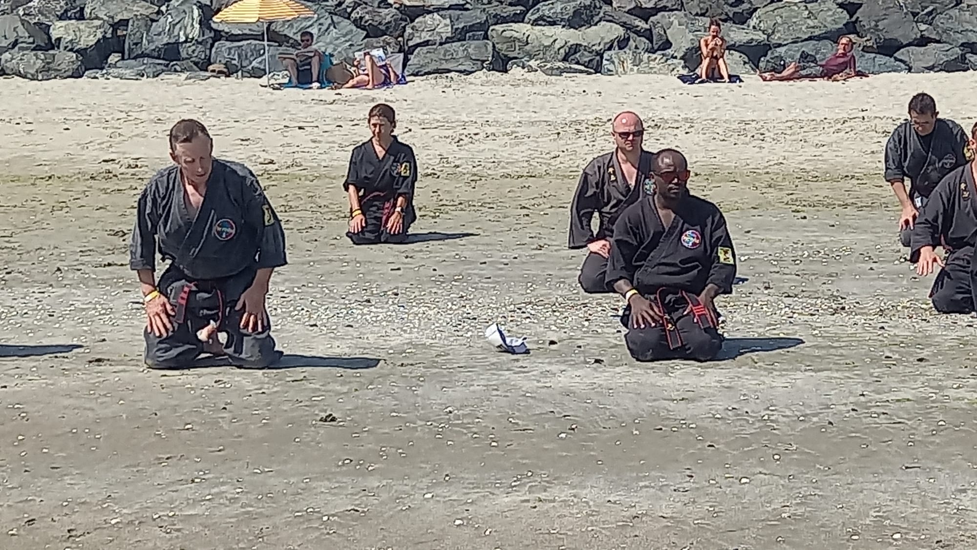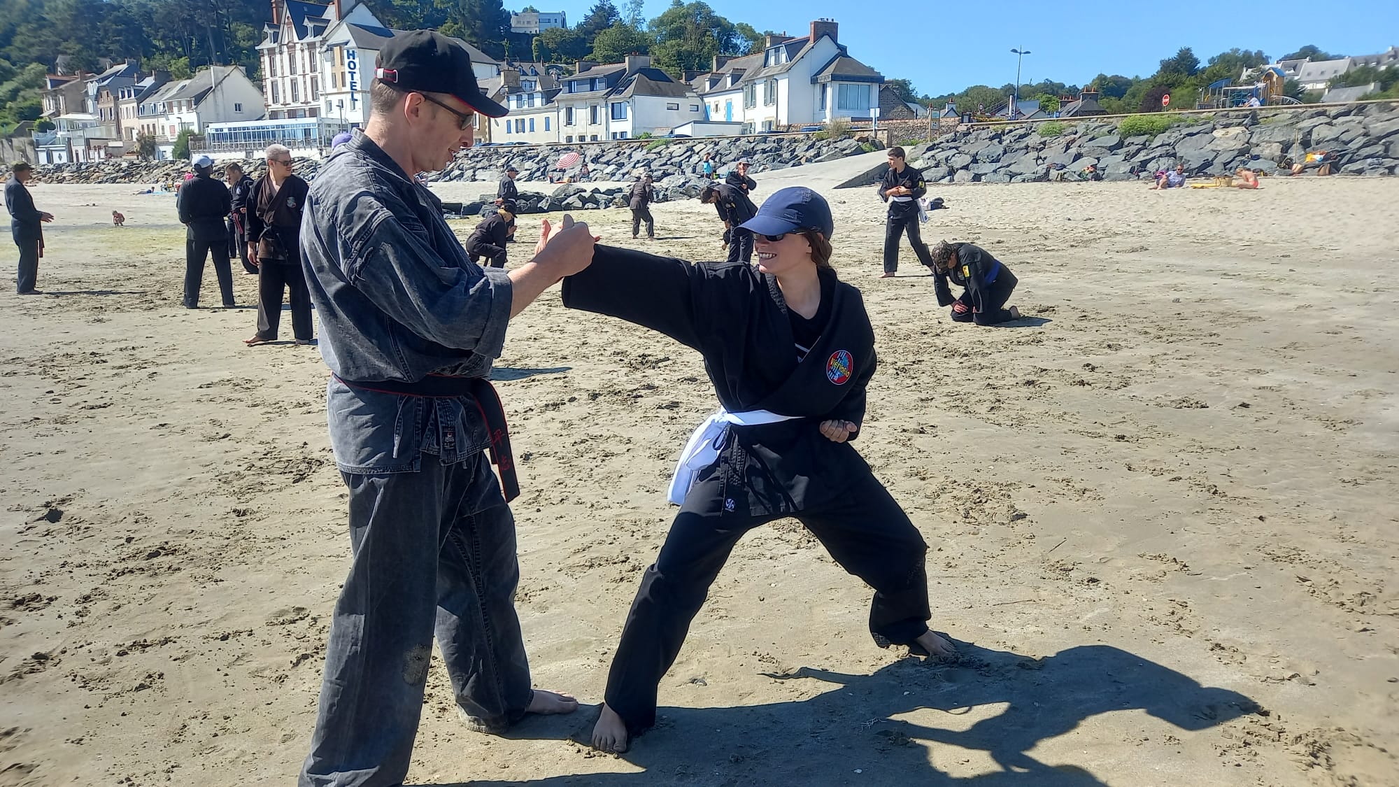 Dès le samedi matin, les plus matinaux ont lancé le stage par un footing avec Maëva, avant de se retrouver tous ensemble sur le sable pour une première session technique sous un soleil écrasant. Au programme : révisions des quyền mains nues de l’École, concentration… et transpiration ! L’après-midi libre a permis à chacun de récupérer à sa manière : balade, baignade, glace ou sieste. Le soir, tout le monde s’est retrouvé autour d’un bon repas au restaurant.