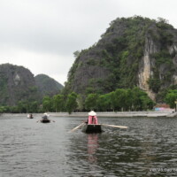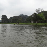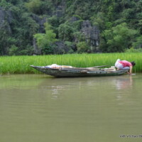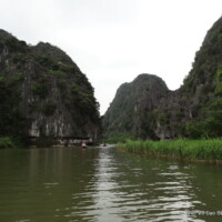 Promenade en sampans (barques à rames utilisées avec les pieds) dans le relief impressionnant et surprenant de la « Baie d’Ha Long terrestre », rivière entourée de rizières puis de paysages montagneux creusés de grottes que l’on traverse, puis de rochers escarpés bordant les deux rives.