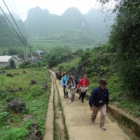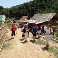 Après une halte pour manger, nous avons entamé la route de montagne et découvert des paysages de rizières en terrasse et de forêts. Perdus dans ce décor vert, de petits villages de paysans émergeaient ça et là. Nous en avons profité pour en visiter un fait de maisons en torchis et bois. En arrivant sur Cao Bang nous avons pu voir une ancienne prison française en ruine. Arrivés à la nuit tombée, nous nous sommes installés à l’hôtel pour un repas et une nuit bien mérités après cette journée passée sur la route.