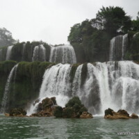 Revenus des entrailles de la terre, nous sommes remontés en minibus, direction la cascade auprès de laquelle nous sommes arrivés vers 12h. Provenant de la rivière Quy Xuan et située à la frontière sino-vietnamienne, elle s’étire sur une largeur de 300m. Nous avons pu l’approcher de très près grâce à de grands radeaux en bambous.